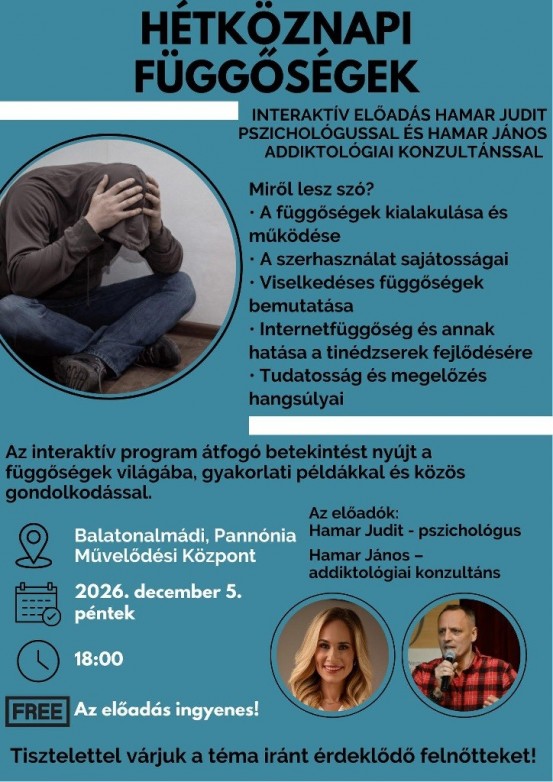December 5-én, pénteken 18 órakor a Pannónia Művelődési Központban iskolánk alapítványának szervezésében Hamar Judit pszichológus és Hamar János addiktológiai konzultáns „Hétköznapi függőségek” címmel tartanak előadást felnőtt korosztály részére.